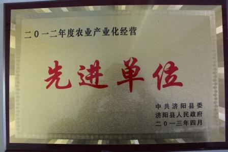 ?????? 4月25號,濟陽縣農業工作會議在政務服務中心隆重召開,縣長王壯主持會議,縣委書記祖愛民作重要講話。會議對2012年度農業工作先進個人及先進集體進行了表彰,我公司獲得了農業產業化經營先進單位稱號,圖片為獎牌。