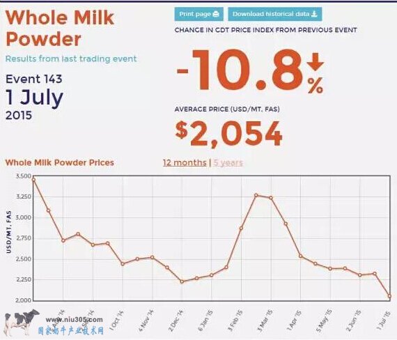 2、7.1全球乳制品笫143次拍賣價,全脂粉已跌至2054美元/噸,脫脂粉為1875美元,預測今下半年至2016上半年回復無望,當中極有可能跌至接近1500美元/噸這一死亡幽魂警界線;